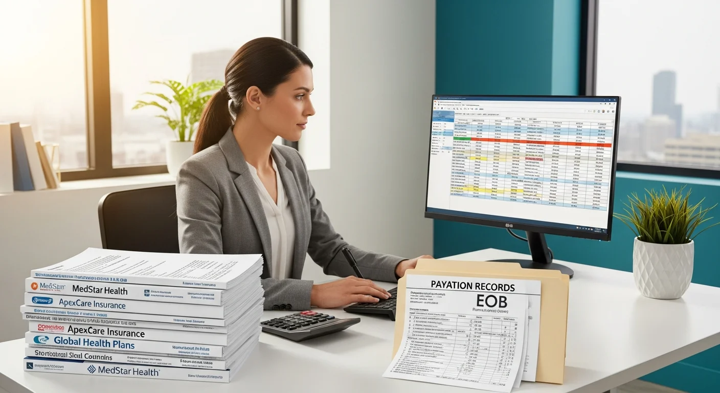Document-based scenarios requiring you to review EOBs, remittance advice, and claims data to identify correct billing actions, modifier application, and payment resolution.